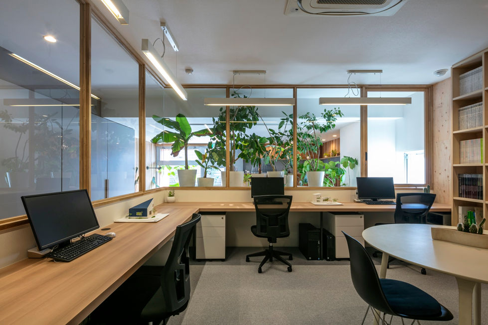 既存天井を取り除き最大限天井高を確保しスキップフロアとすることによって、狭小面積の中でも空間に変化を感じられるつくりとしました。敢えて仕上げを貼らず既存のコンクリートの粗さを残す部分と、新たに無垢板で装う部分でメリハリを設け、素材感を感じられる構成としました。